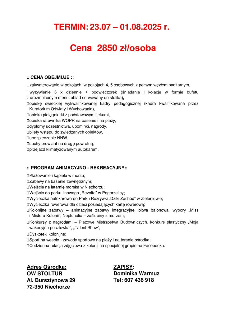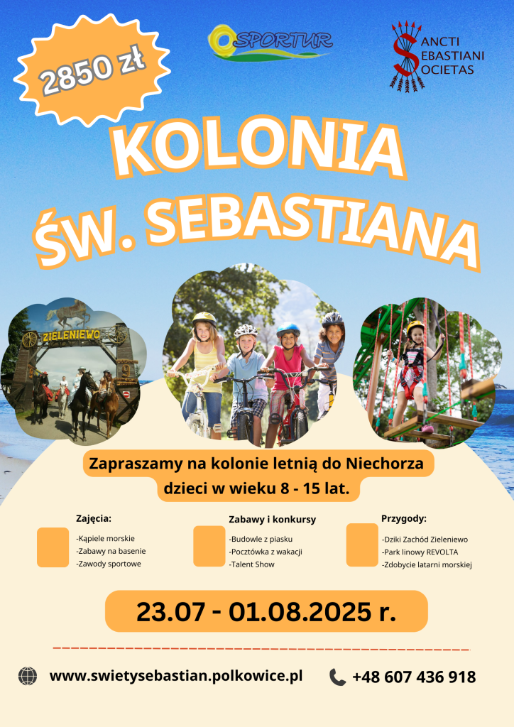 Stowarzyszenie św. Sebastiana po raz kolejny organizuje wakacyjny wypoczynek dla dzieci. W tym roku proponujemy wyjazd do Niechorza. Wszelkie informacje dotyczące kolonii udziela pani Dominika Warmuz.